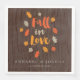 Add a special touch to your fall engagement party, couples' shower, rehearsal dinner, or wedding, with these autumnal napkins. This typographical design features the phrase "fall in love" in brush lettering style font and falling leaves, in orange, brown, and mustard yellow/ochre on a dark wood background. Personalise with your names and wedding date.