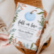 Whimsical and rustic baby shower invitation card featuring illustration of a blue pumpkin with autumn leaves and greenery around the card. The text says