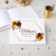 Fall in love with this gorgeous guest book to save all the memories of your special day. The watercolor of deep red and golden sunflowers really pop against the faded leaves. Font style and colour may be changed and the wording can be customised to suit your event.
