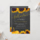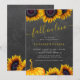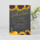 Modern yellow gold sunflowers and pumpkin Fall in Love bridal shower invitation with chic yellow handwriting calligraphy script on a dark grey charcoal chalkboard background. +++++ Suitable for autumn fall rustic country garden backyard farmhouse bridal shower parties.