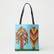 This tote bag has an art deco design of trees coloured for fall made of various shapes on a field of blue.