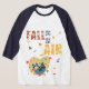 A racoon swings on Earth, surrounded by falling leaves. The racoon enjoys the cool air and beautiful colours of the leaves. The words "Fall in Air" are written in the picture using the shapes of leaves.