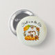 A button with a typography design which says Fall is in the air. Illustrated with an adorable squirrel standing behind some orange watercolor pumpkins. A decorated foliage wreath surrounds them with an oak leaf, an acorn, autumn orange flowers and other sprigs and leaves. Background is a vintage looking off-white with aged light brown edges.