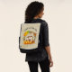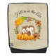 A backpack with a typography design which says Fall is in the air. Illustrated with an adorable squirrel standing behind some orange watercolor pumpkins. A decorated foliage wreath surrounds them with an oak leaf, an acorn, autumn orange flowers and other sprigs and leaves. Background is a light brown vintage grunge texture/image.