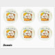 Stickers with a typography design which says Fall is in the air. Illustrated with an adorable squirrel standing behind some orange watercolor pumpkins. A decorated foliage wreath surrounds them with an oak leaf, an acorn, autumn orange flowers and other sprigs and leaves. Background is a vintage looking off-white with aged light brown edges.