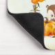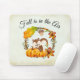 A mousepad with a typography design which says Fall is in the air. Illustrated with an adorable squirrel standing behind some orange watercolor pumpkins. A decorated foliage wreath surrounds them with an oak leaf, an acorn, autumn orange flowers and other sprigs and leaves. Background is a vintage looking off-white with aged light brown edges.