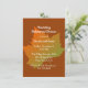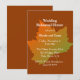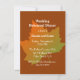 Autumn themed wedding rehearsal dinner invitation, with graphics of a a colourful fall maple leaf, in the middle, against a pumpkin spice coloured background. Personalise the white text to suit your event needs. Invitation is shown on the regular style basic card stock, chose the shape and card stock you prefer.