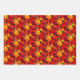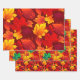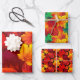 Gift wrapping paper with fall leaves designs. Three sheets come rolled and each has brightly coloured foliage. The first sheet has red, orange and yellow leaves in a big pattern. The second has some green leaves and the pattern is over a golden yellow colour. The third sheet is a smaller leaf pattern over black.