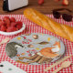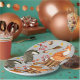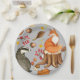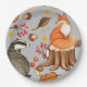 Autumn woodlands themed paper party plates feature fox and badger with leaves, berries, mushrooms and acorns on light grey background.