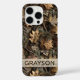 Customise this fall leaves camouflage iPhone 16 pro case with your name in a trendy modern CAP font in brown on opaque cream. It's masculine and perfect for your favourite military, hunting, country or outdoorsman!