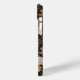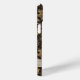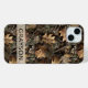 Customize this fall leaves camouflage iPhone 15 plus case with your name in a trendy modern CAP font in brown on opaque cream. It's masculine and perfect for your favorite military, hunting, country or outdoorsman!