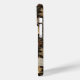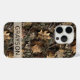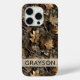 Customize this fall leaves camouflage iPhone 15 pro case with your name in a trendy modern CAP font in brown on opaque cream. It's masculine and perfect for your favorite military, hunting, country or outdoorsman!