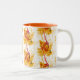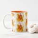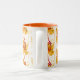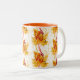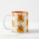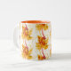 Ceramic coffee mug shown with a pretty autumn fall leaves print.Mug is shown in white with a orange interior colour.