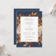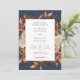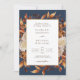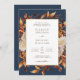 Navy BlueTerracotta Fall Leaves Wedding Invitation. This elegant wedding invitation features beautiful hand-painted watercolor burnt orange, copper, terracotta leaves, cream and beige dahlias, and beautiful rust and brown roses on a navy blue background, perfect for an autumn wedding! The back of the invite has a beautiful branch of leaves with the bride and groom's monogram. Find matching items in the Navy Blue Autumn Romance Wedding Collection.