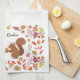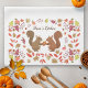 Two happy squirrels exchange a nut gift. Fall leaves and autumn's splendour adorn the scene. Original illustration by Noël Snow.