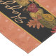 Stylish Fall colours cloth table runner done in graphics of colourful autumn leaves against a black background. An orange on orange leaf pattern band, runs down both sides of the black middle, of the runner. Golden tan text, across the middle of the runner, reads Happiness, Love, Thanks, and Family, and can be personalised to read what you want. Lovely table accent for the Fall and Thanksgiving.