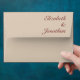 Expectations met; I liked that I had the opportunity to include our address on the back of the envelope. This color matched very well with my save the date. The color was the same as shown above. I had our address labeled on the back of the envelope and the font/printing met my expectations.