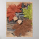 The staged photo of fall coloured leaves surrounds two small hearts. The leaves are made of a jute material and give added texture to the artwork. The original photo is masked to add even more variety with a tan background.