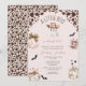 Throw a spook-tacular celebration with this charming “A Little Boo” baby shower invitation! Perfect for fall or Halloween-themed showers, this design blends rustic Western style with soft, cosy details. The invitation features an adorable cow-print ghost wearing a cowboy hat with a bow, surrounded by cowhide print accents, blush pink pumpkins tied with ribbons, and little bats flying around. The muted pink and brown colour palette creates a warm, inviting look that is perfect for autumn gatherings.