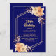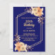 A classy and elegant birthday invitation featuring an orange flower and brown leaves arrangement with modern gold typography on a navy blue background.