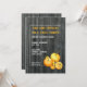 An invitation featuring a background of barnwood on front and back. Front features illustration of a pile of small and large pumpkins at bottom right with the effect of chipped paint. Personalise the Orange and white text with details of your occasion.