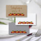 Fall themed, flat place cards for a Thanksgiving dinner or other autumn event, such as a wedding or retirement party. A row of pumpkins and red leaves along the bottom with optional “table number” text for a large event. Cards are sold in bulk, with 10 card minimum, so individual names can’t be added.