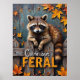 This endearing painting features a detailed racoon with bright eyes, resting on a weathered wooden picket fence. Colourful autumn leaves in shades of orange and yellow decorate the scene, both on the fence and falling around it. The words "Cute but FERAL" are prominently displayed in a combination of white and rustic orange on the fence planks.