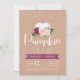 This fall pumpkin baby shower invitation features a kraft look background and whimsical fonts reading "A Sweet Little Pumpkin Is On The Way!" A white watercolor pumpkin and burgundy and blush flowers are elegant next to the banner featuring the mum-to-be.
