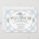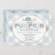 This boy baby shower invite features sparkle glittery text and confetti with a gingham background pattern in blue and white. The backside design is the same gingham pattern but reversed with blue background and white gingham. This invitation is perfect for a fall baby shower.
