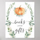 This baby shower books and gifts poster features a watercolor pumpkin and fall greenery gold foliage wreath.