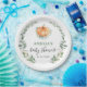 This baby shower paper plate features a watercolor pumpkin and fall greenery gold foliage wreath.