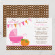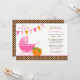 A trendy girl autumn baby shower invitation. Featuring a bunting banner pennant, pumpkin, stroller carriage and polka dots. Shown in shades of pink, orange and brown.