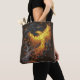 A phoenix rises in a windswept swoop of autumn leaves, steadfast against the image of the blackbird in the sky. By Paxdomino