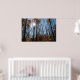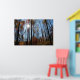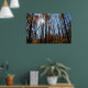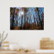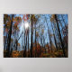 This poster features the sun shining through tall autumn trees. Colourful leaves, blue sky.