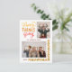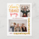 Holiday greeting card featuring a colourful festive phrase "Happy Thanksgiving" with autumn fall leaves and two photos of your choice. Personalised this greeting card with your name and year.