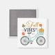 The "Fall Vibes" design is a charming and whimsical illustration that perfectly captures the essence of autumn. The central element of the design is a vintage-style bicycle rendered in a soft, pastel blue colour. The bicycle has a classic, retro look with curved handlebars and a basket attached to the front.