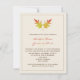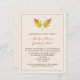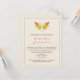 A fall wedding invitation featuring an image of two red and yellow oak leaves crossed at top. Pesronalize the text with details of your occasion. Brown border.
