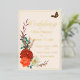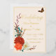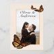 Elegant Gold foil invitation lettering on elegant ivory background is complemented by colourful autumn dahlias, roses, anemone, wheat stalks and monarch butterflies to make a striking but simple wedding invitation. The Monarch butterfly emphasizes the gold foil text on the front and the couple photo on the back for a truly autumnal wedding theme.