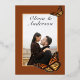 Elegant Gold foil invitation lettering on trendy terracotta background is complemented by colourful autumn dahlias, roses, anemone, wheat stalks and monarch butterflies to make a striking but simple wedding invitation. The Monarch butterfly emphasizes the gold foil text on the front and the couple photo on the back for a truly autumnal wedding theme.