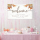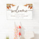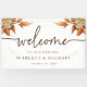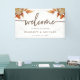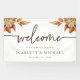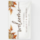 Fall Welcome Wedding Banner. This elegant wedding banner features hand-painted watercolor burnt orange and terracotta leaves, cream and beige dahlias, and beautiful rust-coloured roses on a white background with brown text. Find matching items in the White Autumn Romance Collection.