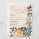 A little pumpkin is on the way! Celebrate your baby shower this fall autumn cute wreath with orange, white and dusty pink pumpkins with green watercolor foliage and flowers on a beige retro background and elegant modern calligraphy typography.