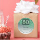 They feature Chic Falling Green Glitter on Green gradient with shiny Stars. On top, the gold and green glitter Birthday Number 50 announces the theme of today’s party the celebration of her Fifty Birthday.