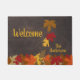 Dress up the entry to your home with this colourful Autumn welcome mat. Maple and oak leaves fall gently to the ground making a leaf pile worthy of jumping in! The colour scheme includes all the hues of the fall season-reds, oranges, golds and more. The background resembles old worn leather. Add your family name to make this pretty fall door mat your very own.