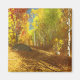 An overgrown path meandering through the birch forest on a sunny autumn day. The black and white trunks of the trees contrast with leaves and grass in all shades of gold, from pale yellow to deep orange, lit by the sun rays streaming through the branches.