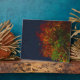 Looking up through the branches of a towering tree in autumn. The falling leaves of burgundy, red, gold, orange, yellow, and blue sparkle against the deep blue sky.