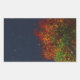 Looking up through the branches of a towering tree in autumn. The falling leaves of burgundy, red, gold, orange, yellow, and blue sparkle against the deep blue sky.