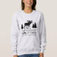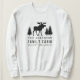Women's sweatshirt with your personalised family name and cabin, cottage or other desired text along with an established date and location. This custom design features rustic style typography with artwork of a moose and pine trees silhouette in black. To see more designs like this, feel free to visit my store here at "Zazzle.com/Rustic_Charm". Thanks.