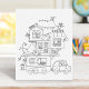 Somewhat haphazardly enhanced 3-story high family trailer is towed by a small car. There is a small vegetable garden on the roof, complete with a scarecrow. An open bathtub on the second floor. A garbage can at the back of the trailer. Some laundry is drying on the wind. Various family pets include a dog, a cat, a chicken, and even some goldfish. A small boy is waving from the trailer window.