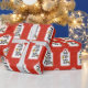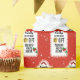 Family text on a candy cane gift tag with gold present, red bow, snowman, and red background.