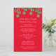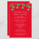 Christmas dinner menu for a family gathering. Red paper with green, ball ornaments hanging across the top. White, casual script, custom text templates for adding the holiday menu list of food. Include the name of the baker next to each dish for a more personalised menu. Makes an affordable keepsake from year to year.